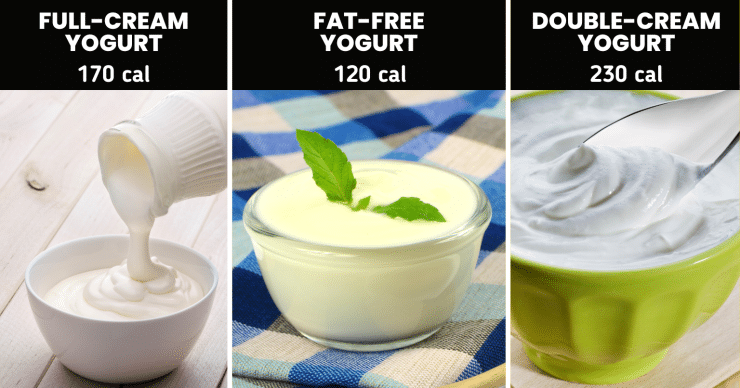 One cup of fat-free yogurt is 120 calories. On the other hand, one cup of full-cream yogurt contains almost 170 calories, and one cup of double-cream yogurt contains about 230 calories.