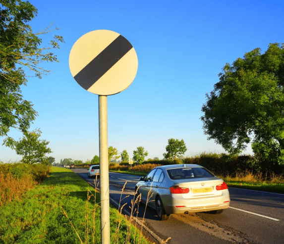 16. “The white circular sign with a black diagonal stripe indicates the national speed limit on the upcoming road stretch, overriding any previous speed limit signs.”