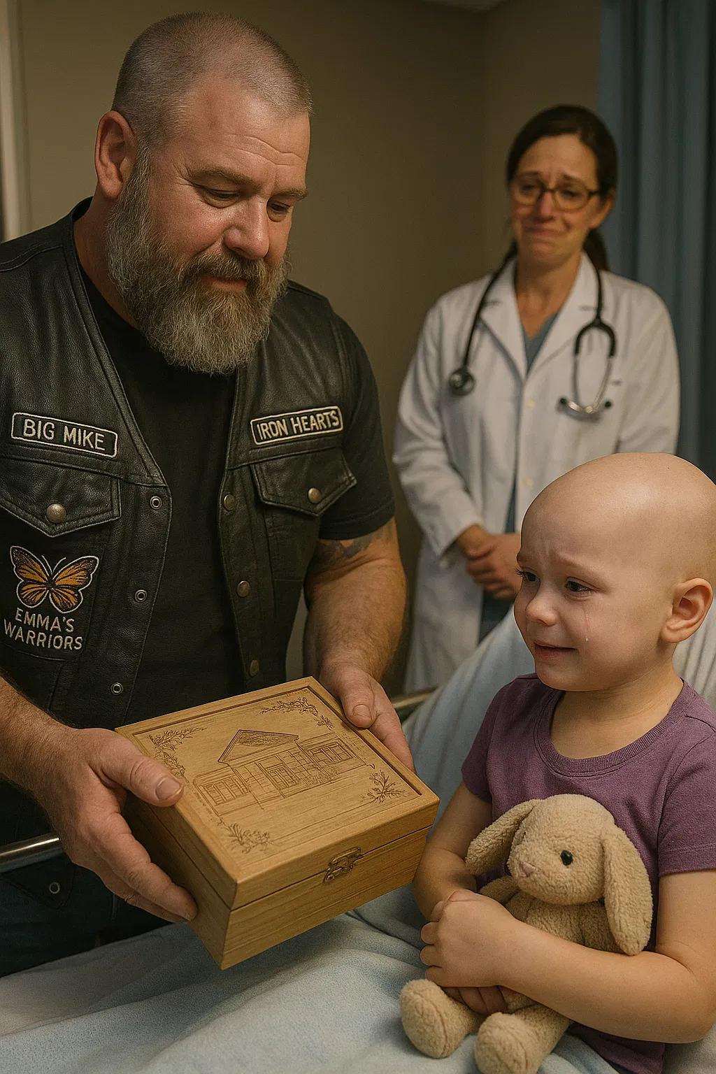 I told Big Mike everything: the diagnosis, the cost, the hopelessness. Without question, he simply nodded and said, “No one fights alone,” tapping his vest. The next day, bikers from the Iron Hearts started showing up for Emma’s treatments, bringing gifts, sitting by her side, and offering strength.