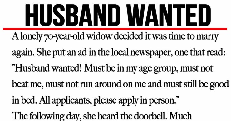 “Husband wanted! Must be in my age group, must not beat me, must not run around on me, and must still be good in bed. All applicants please apply in person.”