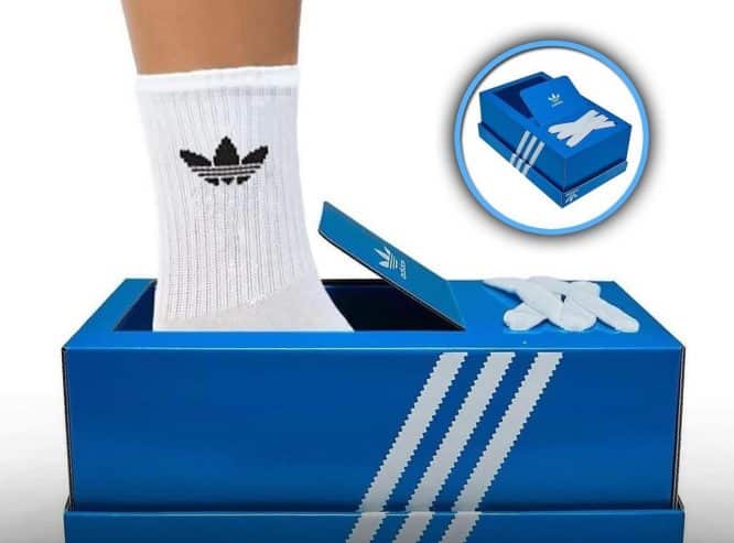 Thick laces hang over the box’s “tongue,” completing the sneaker illusion and encouraging wearers to tie them just like regular shoes. Adorned in the signature blue and white color scheme synonymous with adidas packaging, the shoe boasts branded elements that mirror the iconic look of adidas’ product boxes.