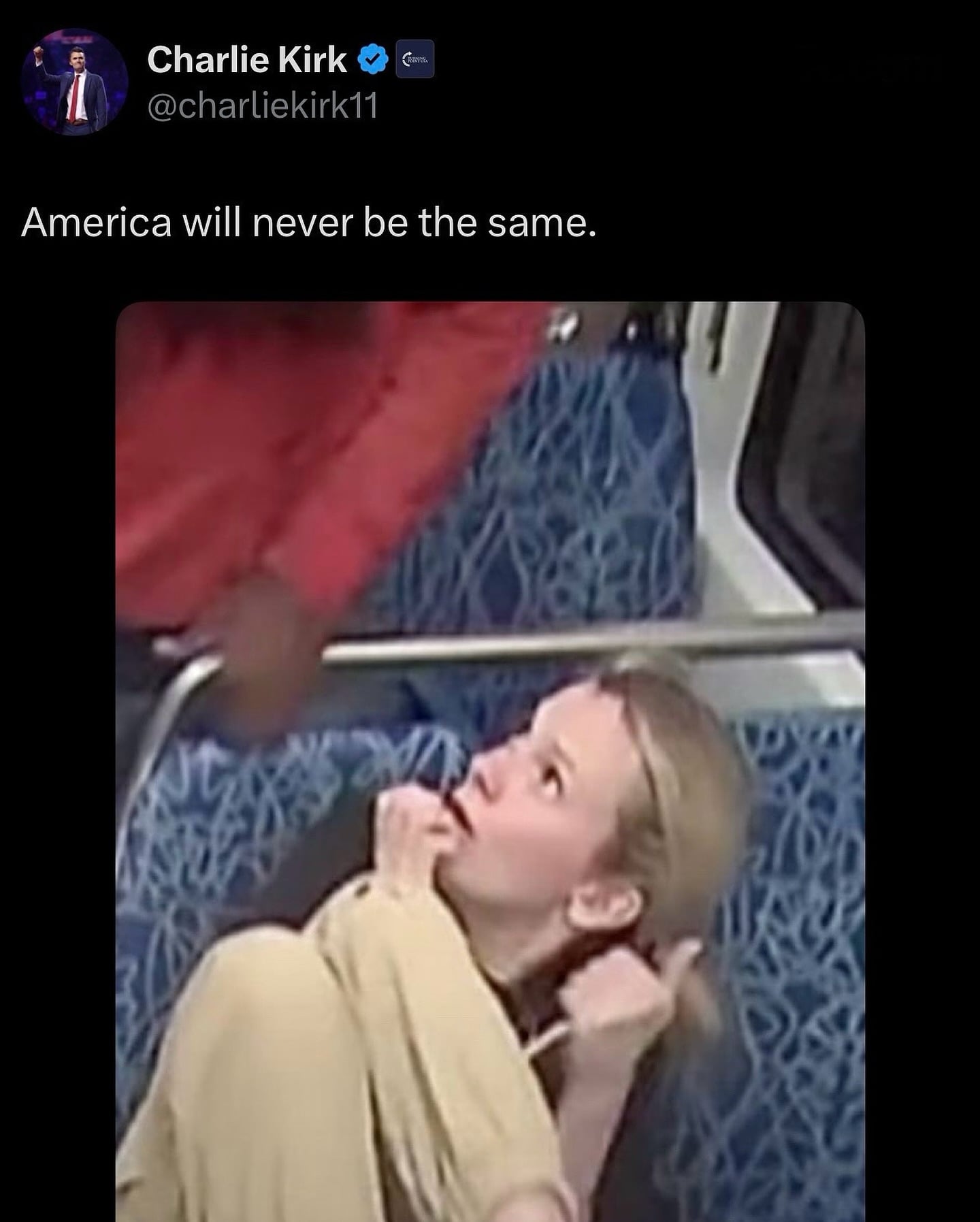 In what has now gone viral, Kirk wrote: “America will never be the same” alongside a photo of Iryna Zarutska, a 23-year-old Ukrainian refugee, who was fatally stabbed aboard a Charlotte light rail train.