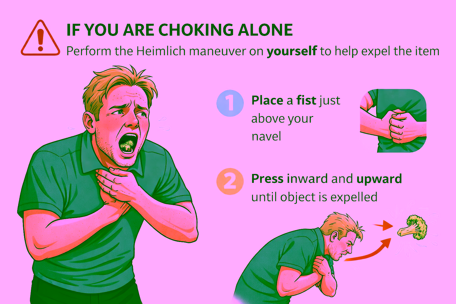 When you are choking alone, it can be tempting to try risky or ineffective actions in a panic. One thing you should not do is stick your fingers into your throat to try to remove the object. If you cannot see the object clearly, this can push it deeper into your airway and make the situation worse. Emergency guidelines from major health organisations strongly advise against this action.