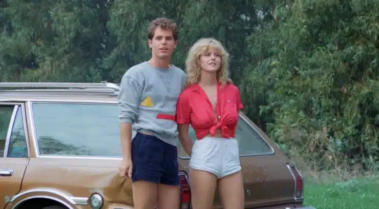 Let’s take a moment to appreciate an intriguing snapshot from “Evil Town.” In this photo, lead actor Lynda Wiesmeier poses with her co-star, both dressed in classic 80s fashion. The man wears a gray sweatshirt decorated with colorful shapes and dark shorts, while the woman sports a bright red shirt tied at her waist, paired with high-waisted white shorts. Ah, the fashion trends of the 80s!