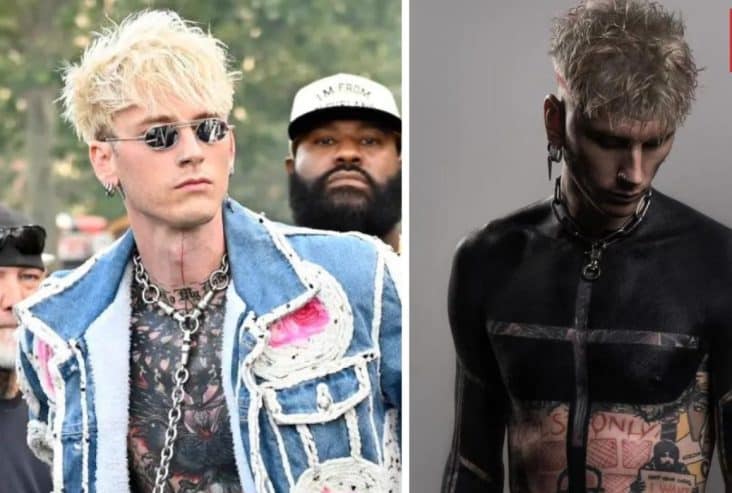Machine Gun Kelly, the Grammy-nominated rapper behind “Bloody Valentine,” unveiled his latest tattoo masterpiece on Instagram, showcasing a bold blackout design covering his upper chest and a significant portion of his arms, even including his nipples. The once vibrant tattoos peek through the intricate cross design formed by negative space on his chest.