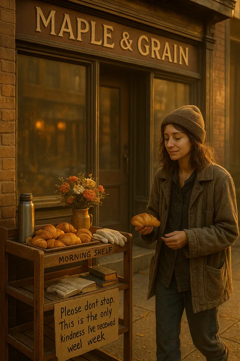 Years passed. Maple & Grain became a landmark—not just for its pastries, but for its quiet, consistent generosity. Volunteers came and went, but The Morning Shelf remained.