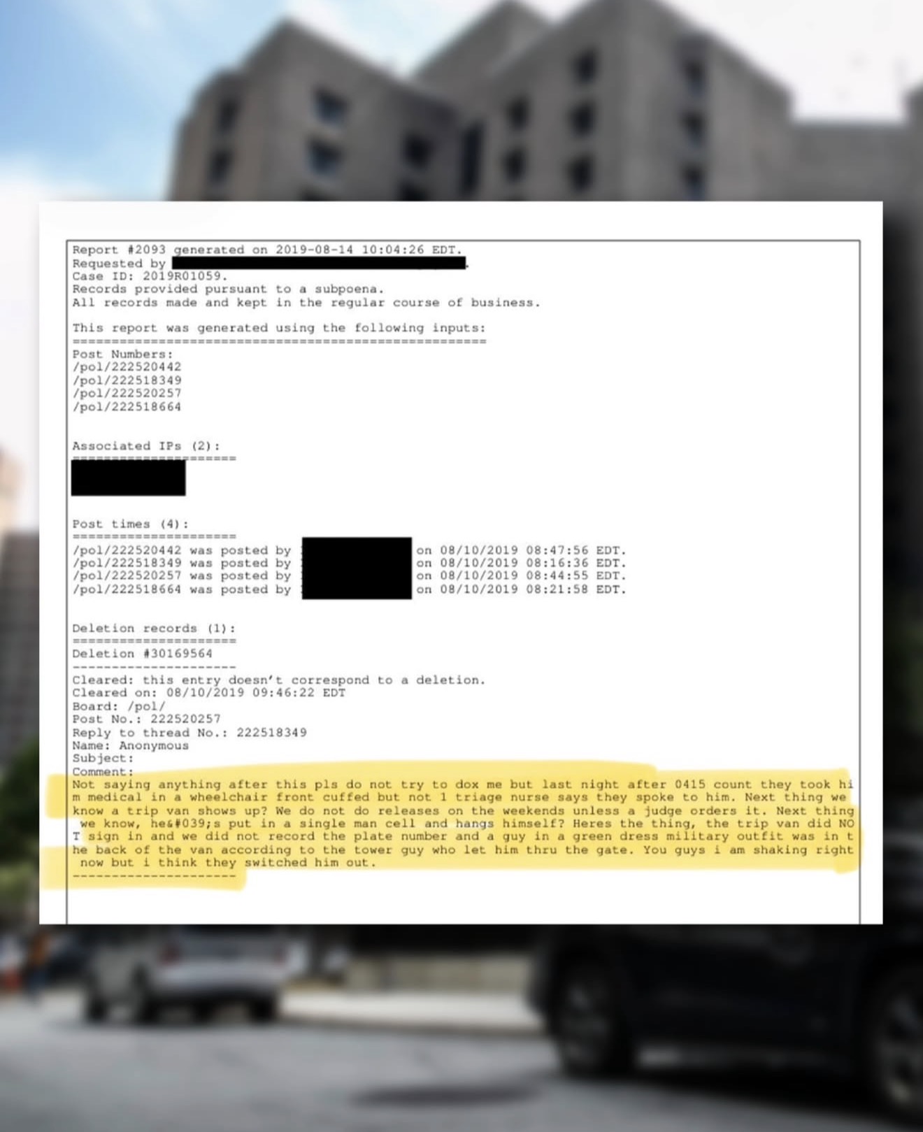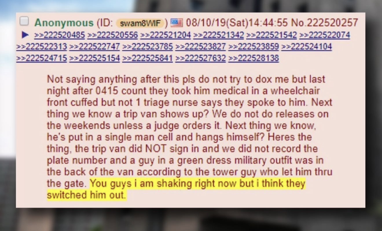 The speculation centers on a controversial 4chan post from the morning of August 10, 2019 — hours before news broke that Epstein was found unresponsive in his Metropolitan Correctional Center (MCC) cell in New York.