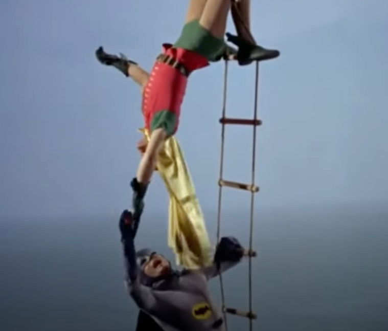 There’s even a blooper in that same scene: when Robin hands Batman the spray, he’s hanging upside down right above him — but seconds later, he’s mysteriously gone.