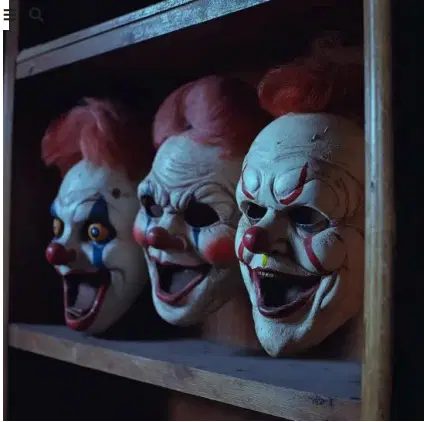 Four heads staring back at me. One with clown makeup. One wrapped in torn red fabric. All frozen in eerie grins.