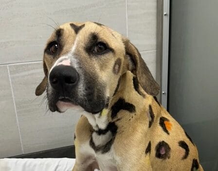 A disturbing case of animal cruelty has come to light in Arizona, where an emaciated dog was found tied up under the scorching sun, with its fur bizarrely painted in leopard-like spots.