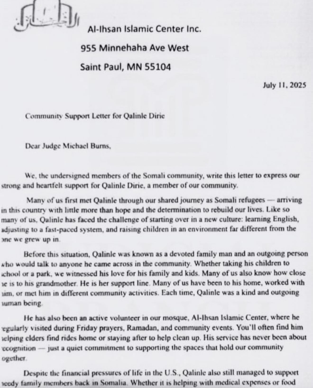 The letter, sent by the Al-Ihsan Islamic Center and dated July 11, 2025, concerns Qalinle Dirie, who is currently facing serious criminal charges. In the document, community leaders describe Dirie as a “devoted family man” and an “active volunteer,” highlighting his involvement with the mosque and his role within the local Somali community.