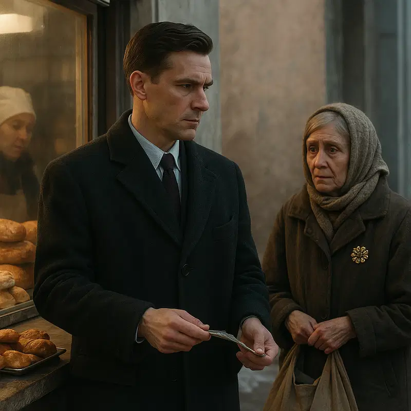 A sharp wind rushed through the old stone streets, carrying with it the chill of snow and the feeling that compassion had grown scarce. She stood before the modest bread stall, her coat threadbare, her face etched with deep lines — each wrinkle telling stories of hope, hardship, and quiet endurance.