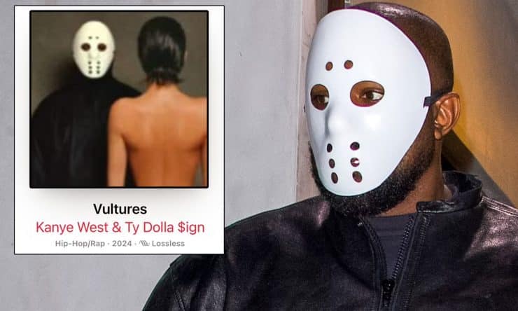 In the photo, West stands beside her, clad in all black attire, complemented by a white mask reminiscent of Friday the 13th. Censori’s back is partially obscured by a sheer black material cinched with a thin waistband, accentuating her slender waist. Additionally, she wears thigh-high black pantyhose and high heels, posing with her back to the camera.