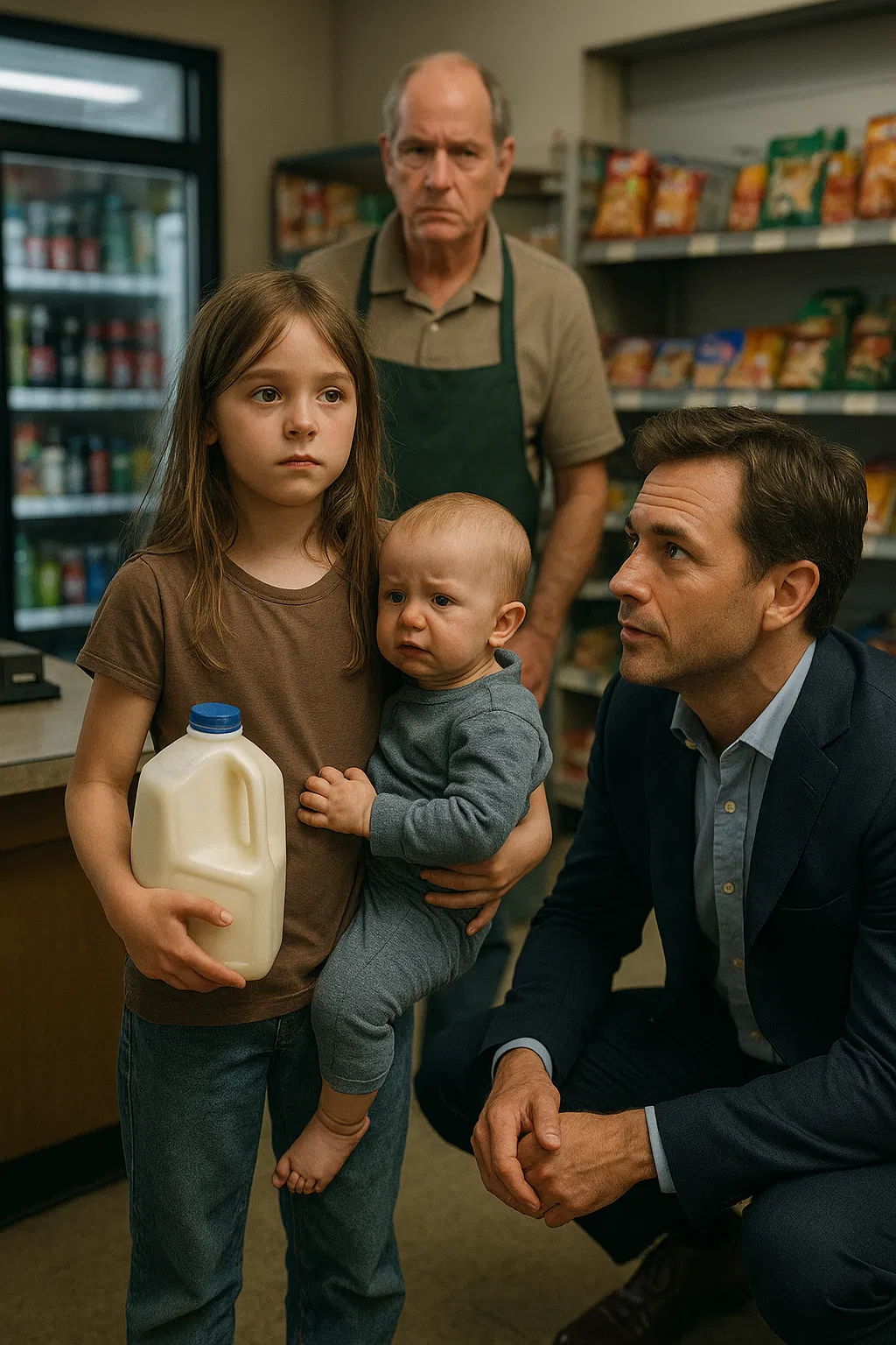 Kayla did not move. She rocked her baby brother, Ben, gently as he whimpered, his small hands curling against her. Mr. Oliver started to reach for the phone when the store’s door opened with a chime.