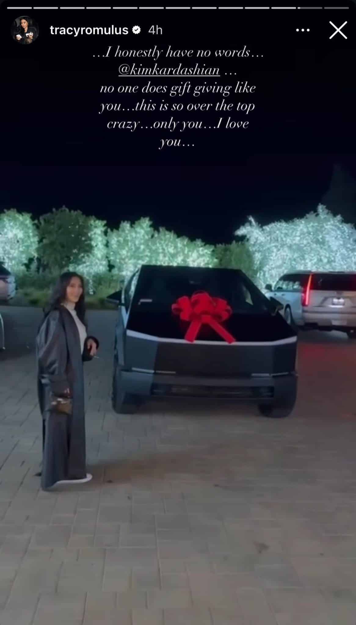 Tracy, who is also the chief marketing officer of KKW Brands, shared her shock and gratitude in the post, writing, “You’ve officially lost your mind, @kimkardashian… I’m still in shock…” In a follow-up clip, she became emotional, saying, “I honestly have no words…@kimkardashian… no one does gift-giving like you. This is so over-the-top crazy… only you. I love you.”