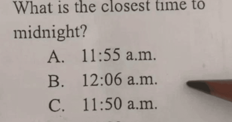 In June 2023, @yawdmontweet, a Twitter user from Jamaica, posed a puzzling question: “What’s the closest time to midnight?” Options included 11:55 a.m., 12:06 a.m., 11:50 a.m., and 12:03 a.m.