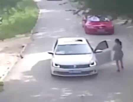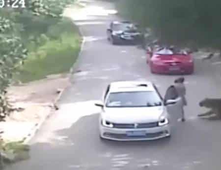 The video shows her exiting the vehicle and walking toward the passenger side when a tiger suddenly appears and drags her away.