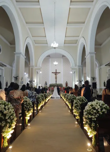 White roses lined the aisle, their scent blending with the soft aroma of candle wax.