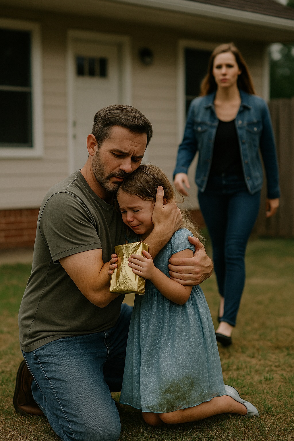 We arrived within ten minutes. Before the car had fully stopped, I was out. Sophie stood by the fence, clutching her gold-wrapped gift like it was the only thing keeping her steady. Her cheeks were blotchy, eyes swollen, and the hem of her dress was streaked with grass stains.