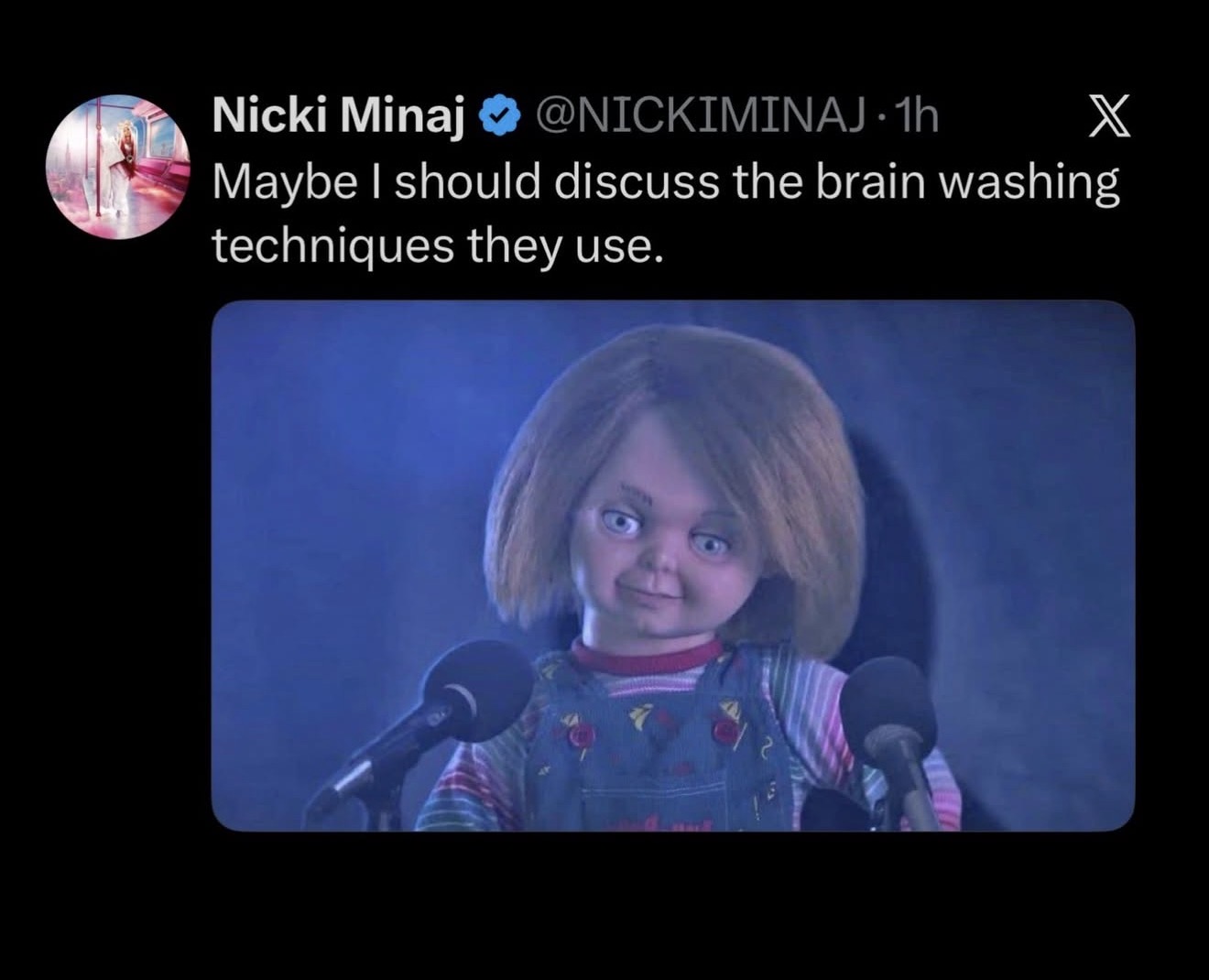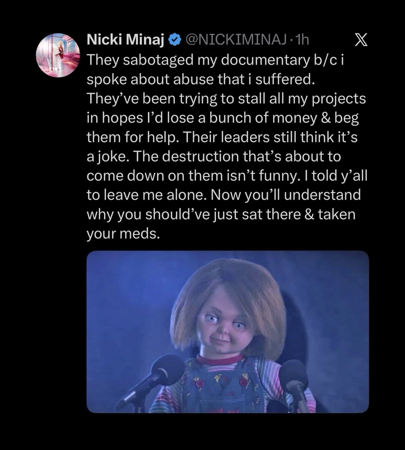 In her posts, Minaj accused figures within the music industry of engaging in satanic practices, claiming children from other countries are harmed and used as so-called “blood sacrifices” in exchange for power. She framed the accusations as part of what she described as a long-standing culture of industry satanism.