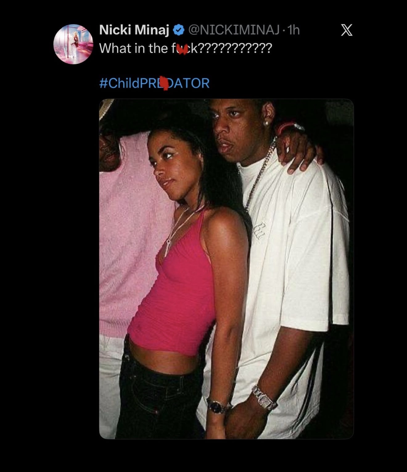 Nicki Minaj sparked controversy on Monday after sharing a series of incendiary posts on X, in which she made extreme allegations against an unnamed “favorite artist” — widely interpreted by users as Jay-Z. The implication stemmed from images she shared of the rapper alongside Aaliyah and Beyoncé.