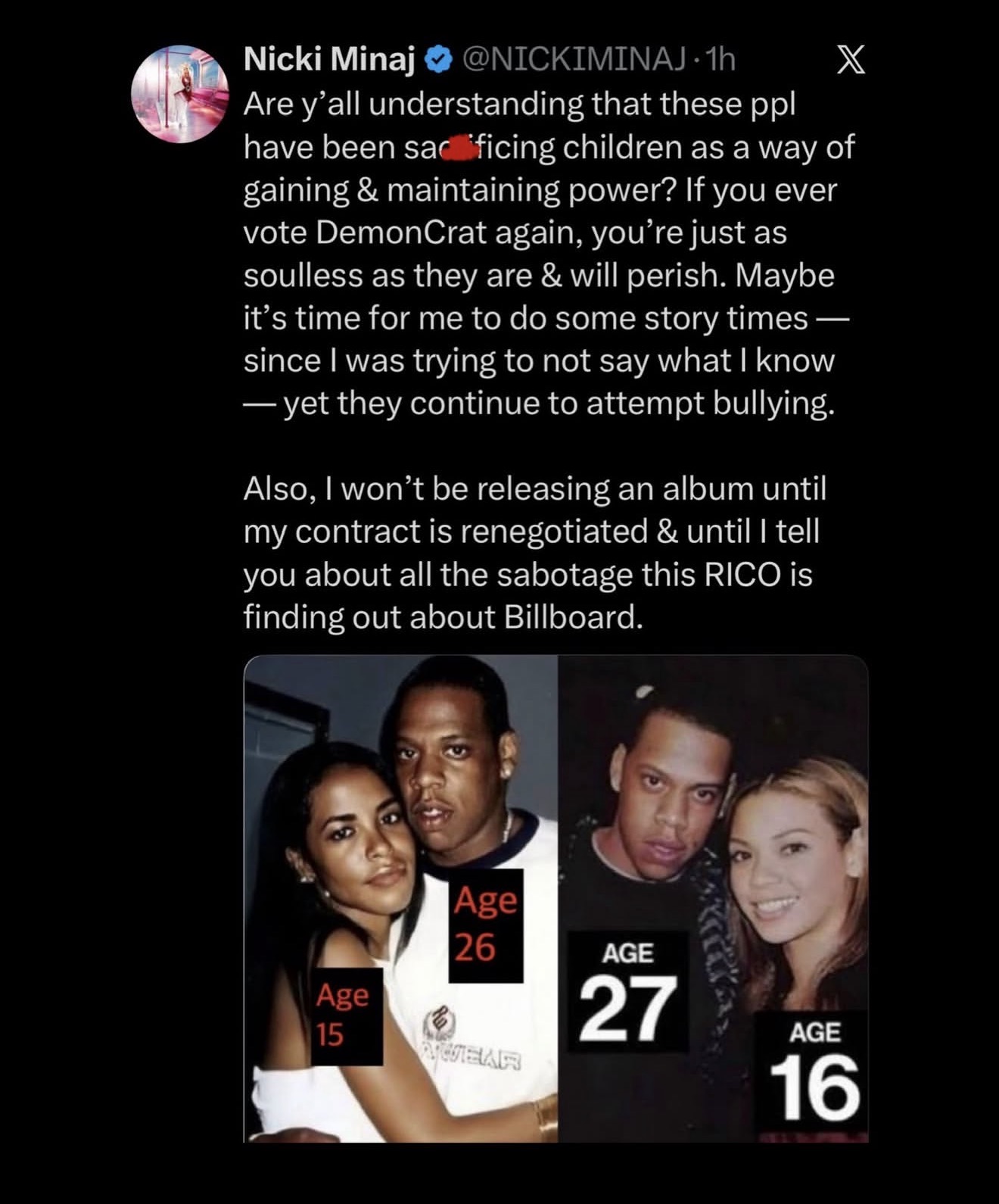 Nicki Minaj accuses Jay-Z of satanic baby sacrifices and being a child pr*dator in recent X posts