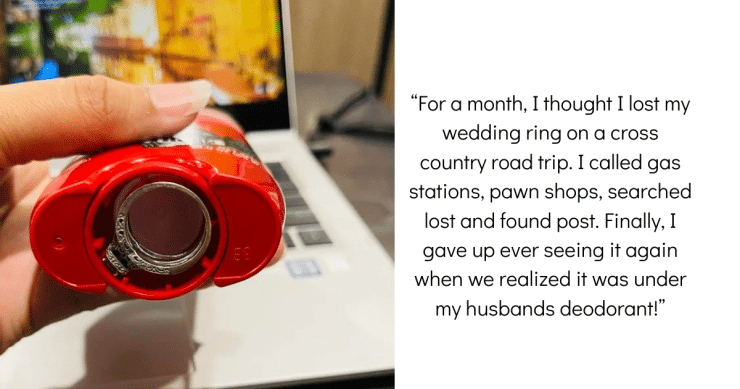 8. “For a month, I thought I lost my wedding ring on a cross country road trip. I called gas stations, pawn shops, searched lost and found post. Finally, I gave up ever seeing it again when we realized it was under my husbands deodorant!!”