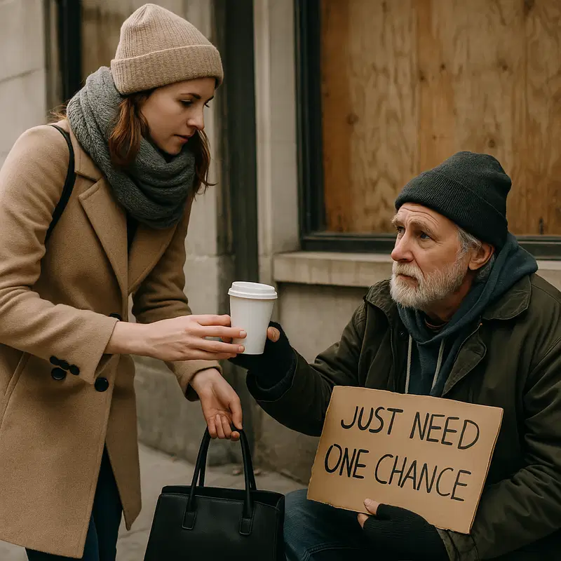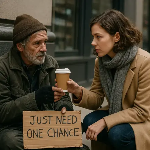 There was a quiet strength about him. Something steady and self-possessed. Despite the worn clothes and the cardboard plea, he spoke with elegance—measured, thoughtful, and kind.