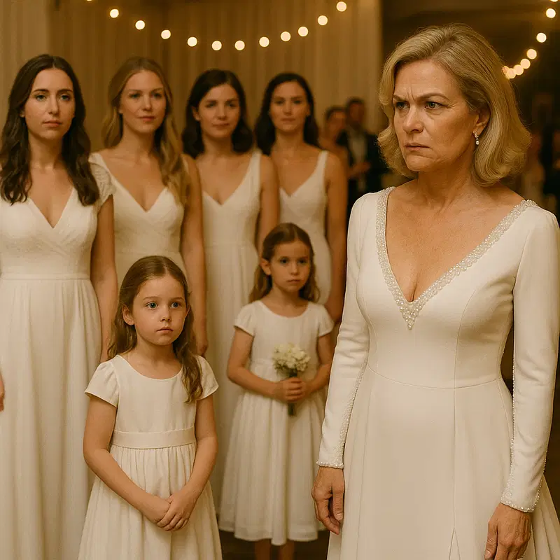 On the day of the wedding, guests arrived to a breathtaking scene: every bridesmaid — from maid of honor to the flower girls — wore elegant, flowing white gowns that could easily pass for wedding dresses. The venue shimmered with bridal beauty, a coordinated vision of white that made heads turn.