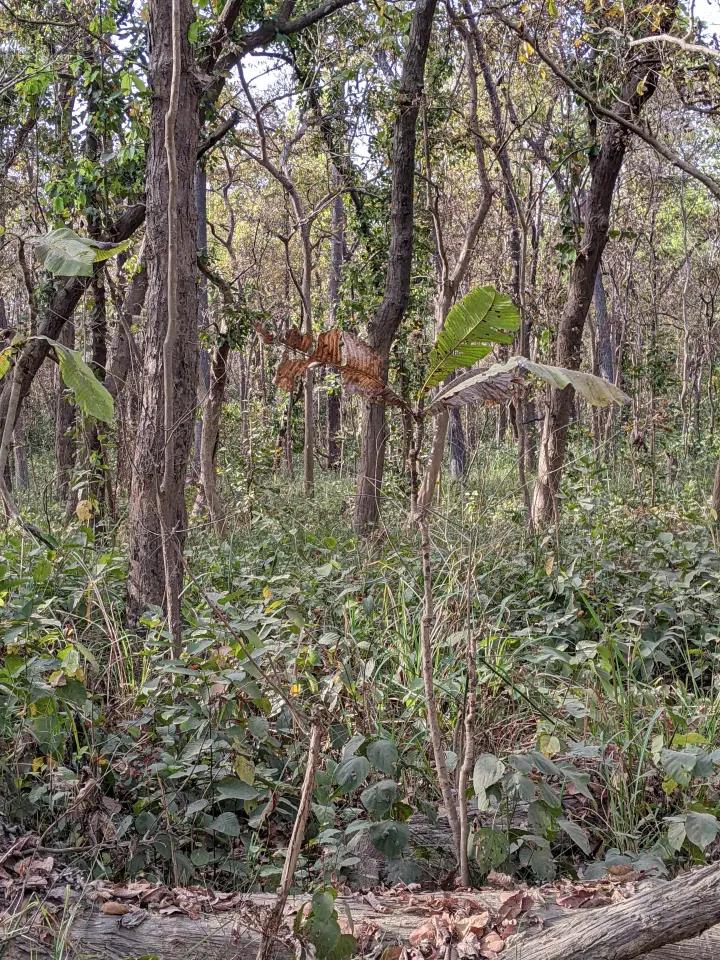 So, where is the tiger exactly? Look carefully just below the central tree. There, crouched among the leaves, is the hidden predator. Its striped pattern melts into the jungle shadows, making it nearly invisible unless you concentrate.