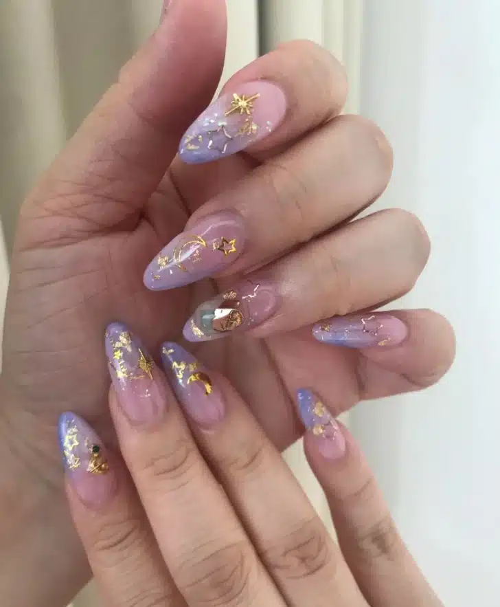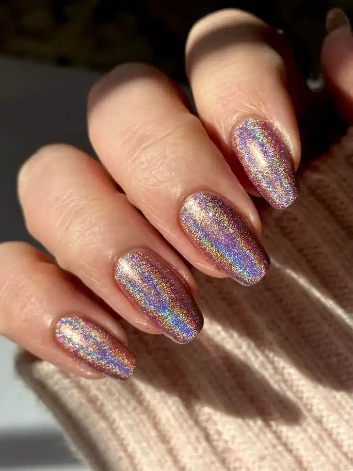 Holographic nails offer a futuristic and multidimensional appearance, with colors that shift and change under different lighting. This trend is perfect for those looking to add a bit of sparkle and mystery to their manicure, making your nails the center of attention.