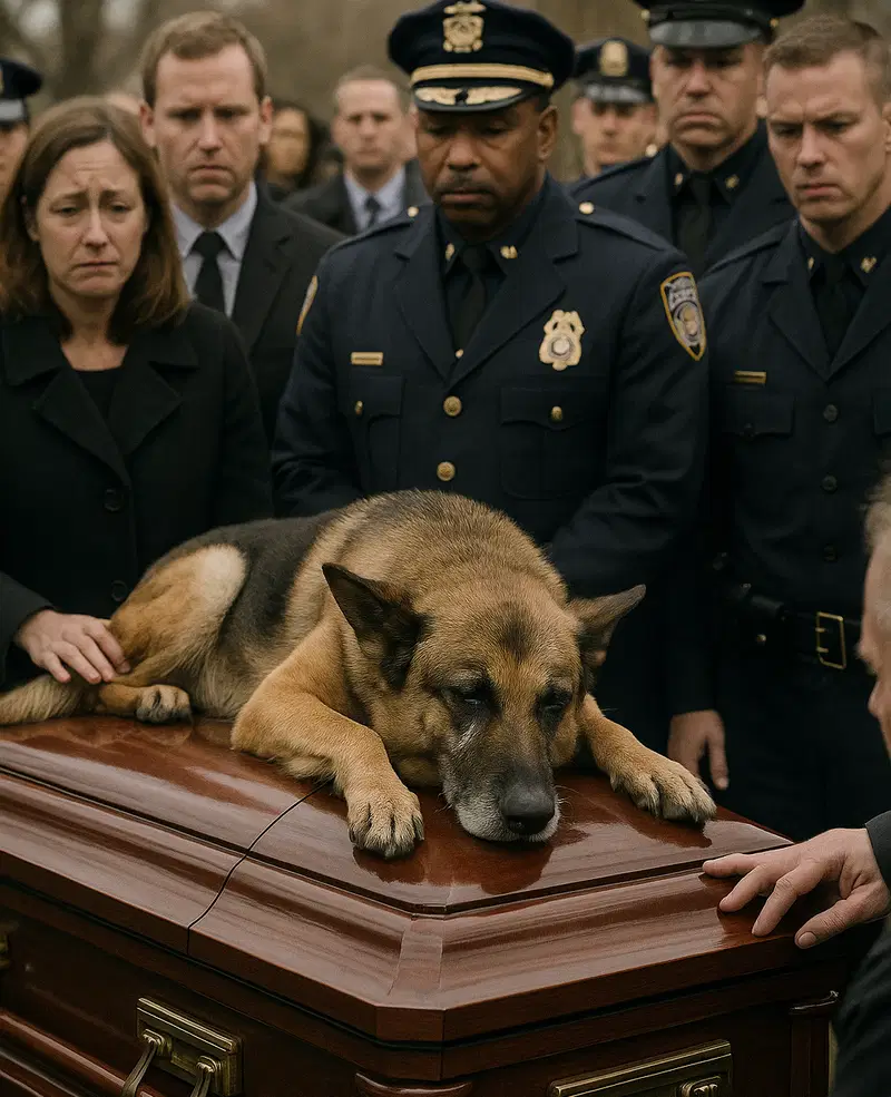 With a swift yet gentle leap, Bella landed on top of the coffin. She curled against it, laying her head tenderly across the surface. A soft whimper escaped her, and to the shock of those standing nearby, tears slipped down her face. The crowd stood frozen. When a few tried to move her, she resisted — her body trembling, her breathing shallow.