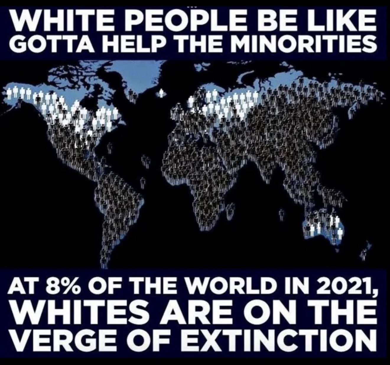 A widely shared image has recently gone viral on social media. The graphic shows a world map overlaid with figures and bold text reading: “White people be like gotta help the minorities. At 8% of the world in 2021, whites are on the verge of extinction.”